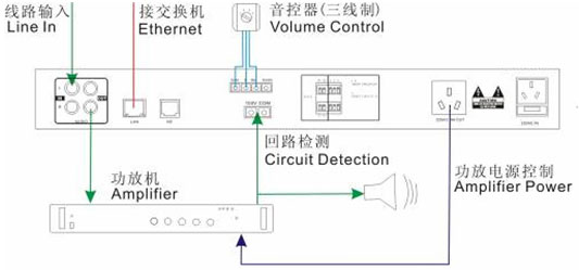 3.音頻線路輸出,接外部功放擴音(帶回路檢測,可監(jiān)聽);