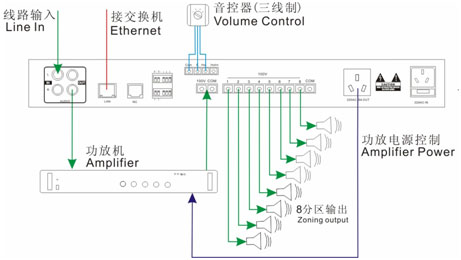 3. 先將定壓功放的功率線接回到音頻終端,然后由終端分區(qū)輸出到音箱,分區(qū)的選擇無需在終端上操作,在系統(tǒng)服務(wù)器遠(yuǎn)程控制即可;
