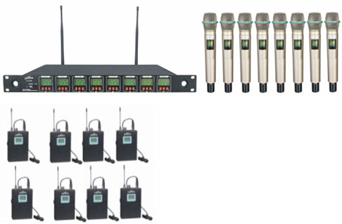 一拖八無(wú)線麥克風(fēng)可配手持麥、領(lǐng)夾腰包。