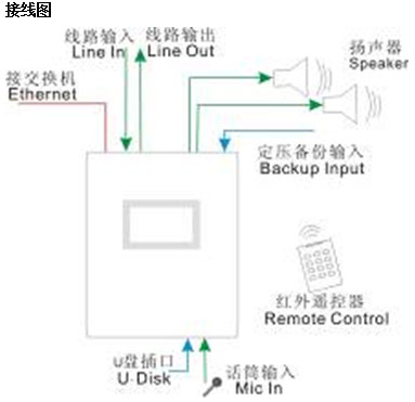 6. 可選配U盤播放、無線話筒模塊、定壓備份廣播(接入100V定壓廣播線路作為備用,符合教委重要考試必須有備用系統(tǒng),雙路同時工作的要求);