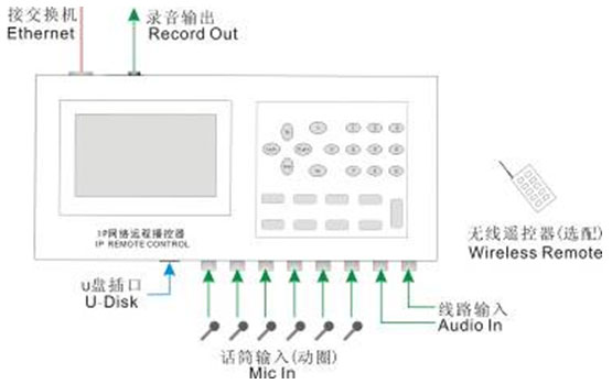 5.一鍵式廣播功能(具有8個(gè)可編程廣播按鍵, 預(yù)設(shè)節(jié)目源和目標(biāo)分區(qū)), 可選配無線遙控器(其數(shù)字鍵也是用于一鍵廣播, 500范圍);