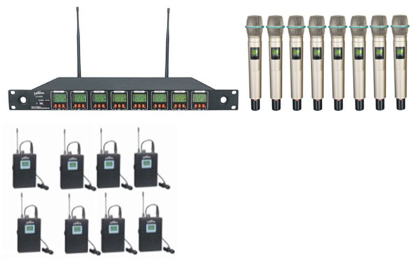 一拖八無線麥克風(fēng)可配手持麥、領(lǐng)夾腰包。